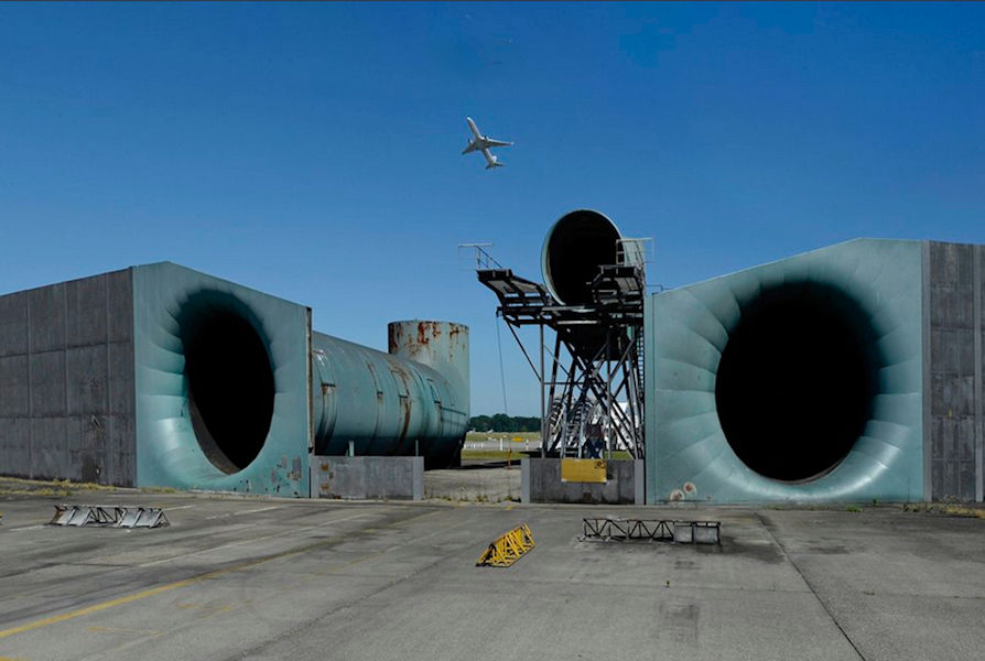 Voici la génération antérieure des dispositifs acoustiques utilisés pour réduire le bruit lors des essais moteurs (équipement sur le tarmac de Zurich, vue trouvée sur le Web)